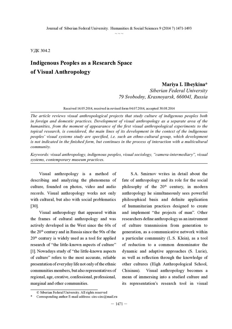 Библиографическое описание: Ilbeykina, Mariya. Indigenous Peoples as a Research Space of Visual Anthropology = Индигенные народы как исследовательское пространство визуальной антропологии / M. I. Ilbeykina. - Текст : непосредственный // Журнал Сибирского федерального университета. Гуманитарные науки. - 2014. - Т. 7, № 9. - С. 1471-1493 : ил. - Библиогр.: с. 1485-1493 (109 назв.). - ISSN 1997-1370.