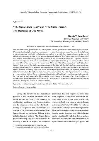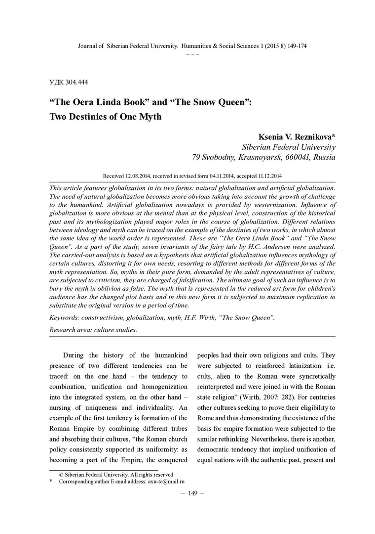 Библиографическое описание: Reznikova, Ksenia. "The Oera Linda Book" and "The Snow Queen": Two Destinies of One Myth = "Хроника Ура Линда" и "Снежная Королева": две судьбы одного северного мифа / K. V. Reznikova. - Текст : непосредственный // Журнал Сибирского федерального университета. Гуманитарные науки. - 2015. - Т. 8, № 1. - С. 149-174. - Библиогр.: с. 172-174 (21 назв.). - ISSN 1997-1370.