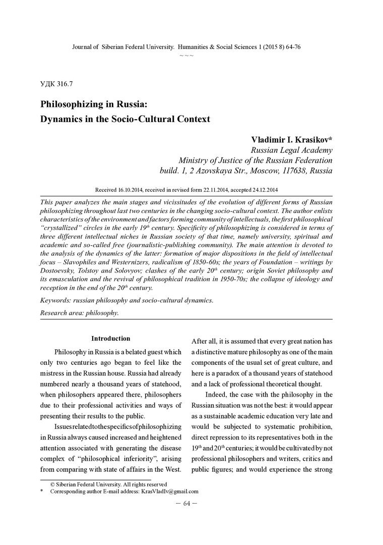Библиографическое описание: Krasikov, Vladimir. Philosophizing in Russia: Dynamics in the Socio-Cultural Context = Философствование в России: динамика в социокультурном контексте / V. I. Krasikov. - Текст : непосредственный // Журнал Сибирского федерального университета. Гуманитарные науки. - 2015. - Т. 8, № 1. - С. 64-76. - Библиогр.: с. 76 (3 назв.). - ISSN 1997-1370.