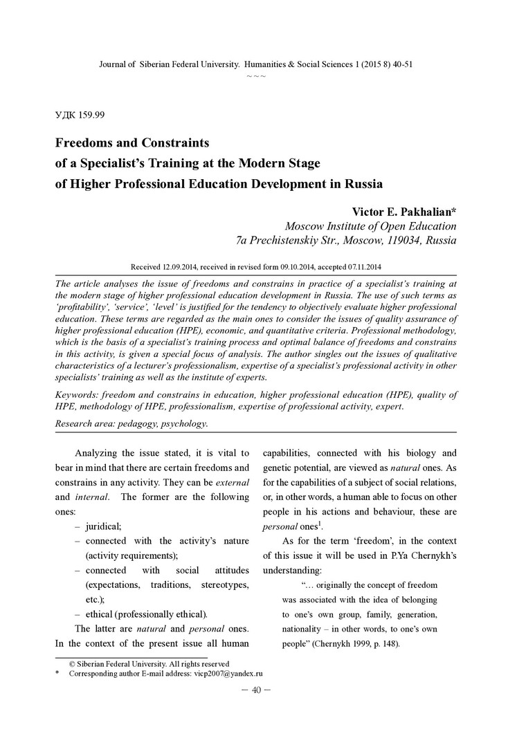 Библиографическое описание:Pakhalian, Victor. Freedoms and Constraints of a Specialist`s Training at the Modern Stage of Higher Professional Education Development in Russia = Свободы и ограничения подготовки специалиста на современном этапе развития высшего профессионального образования в России / V. E. Pakhalian. - Текст : непосредственный // Журнал Сибирского федерального университета. Гуманитарные науки. - 2015. - Т. 8, № 1. - С. 40-51. - Библиогр.: с. 50-51 (13 назв.). - ISSN 1997-1370.
