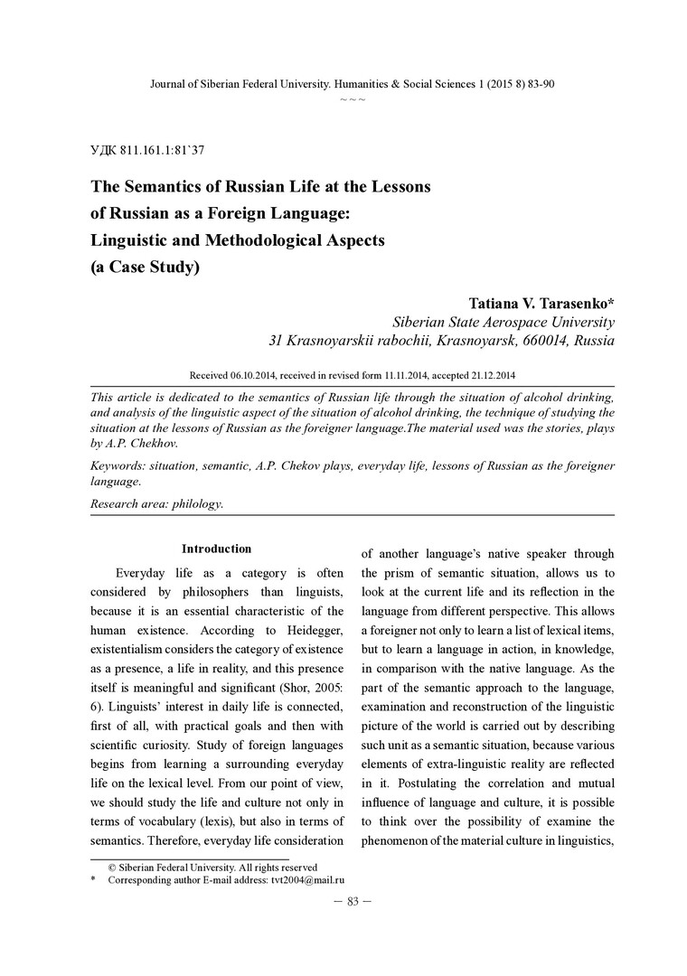 Библиографическое описание:Tarasenko, Tatiana. The Semantics of Russian Life at the Lessons of Russian as a Foreign Language: Linguistic and Methodological Aspects (a Case Study) = Семантика русского быта на уроках русского как иностранного (лингвистический и методический аспекты) / T. V. Tarasenko. - Текст : непосредственный // Журнал Сибирского федерального университета. Гуманитарные науки. - 2015. - Т. 8, № 1. - С. 83-90. - Библиогр.: с. 89-90 (15 назв.). - ISSN 1997-1370.