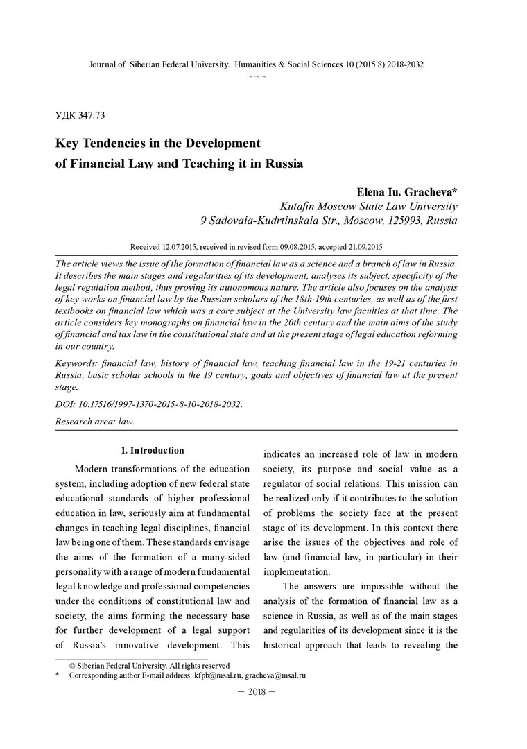 Библиографическое описание:Gracheva, Elena. Key Tendencies in the Development of Financial Law and Teaching it in Russia = Основные тенденции развития науки финансового права и ее преподавания в России / E. Iu. Gracheva. - Текст : непосредственный // Журнал Сибирского федерального университета. Гуманитарные науки. - 2015. - Т. 8, № 10. - С. 2018-2032. - Библиогр.: с. 2029-2032. - ISSN 1997-1370.