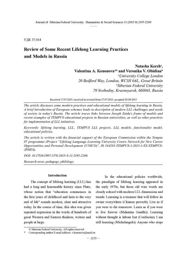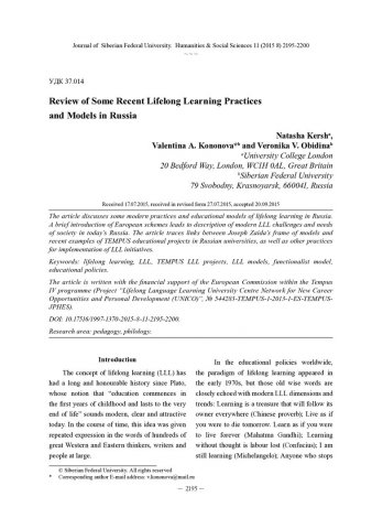 Библиографическое описание: Kersh, Natasha. Review of Some Recent Lifelong Learning Practices and Models in Russia = Обзор некоторых моделей и практического опыта реализации парадигмы "образование в течение жизни" в России / N. Kersh, V. A. Kononova, V. V. Obidina. - Текст : непосредственный // Журнал Сибирского федерального университета. Гуманитарные науки. - 2015. - Т. 8, № 11. - С. 2195-2200. - Библиогр.: с. 2199-2200. - ISSN 1997-1370.