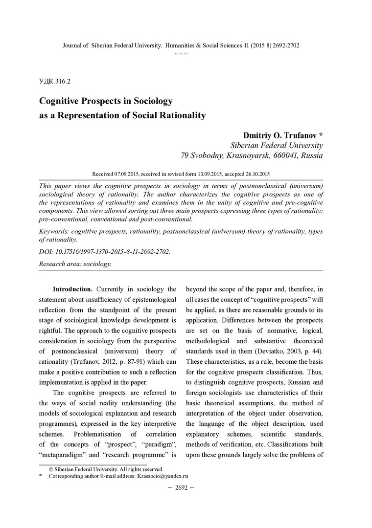 Библиографическое описание:Trufanov, Dmitriy. Cognitive Prospects in Sociology as a Representation of Social Rationality = Познавательные перспективы в социологии как репрезентация социальной рациональности / D. O. Trufanov. - Текст : непосредственный // Журнал Сибирского федерального университета. Гуманитарные науки. - 2015. - Т. 8, № 11. - С. 2692-2702. - Библиогр.: с. 2700-2702. - ISSN 1997-1370.