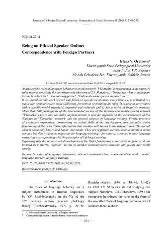 Библиографическое описание:Osetrova, Elena. Being an Ethical Speaker Online: Correspondence with Foreign Partners = Правила речевого поведения в сетевом сообществе: переписка с участием иностранцев / E. V. Osetrova. - Текст : непосредственный // Журнал Сибирского федерального университета. Гуманитарные науки. - 2015. - Т. 8, № 11. - С. 2561-2571. - Библиогр.: с. 2570-2571. - ISSN 1997-1370.