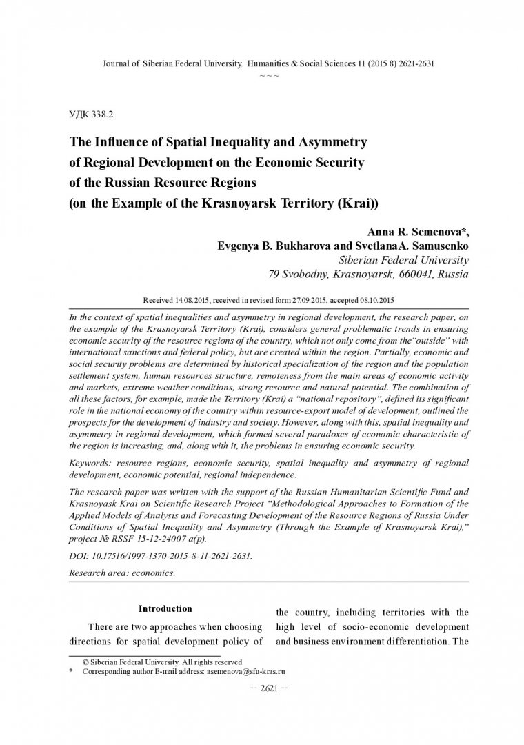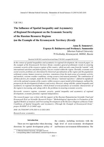 The Influence of Spatial Inequality and Asymmetry of Regional Development on the Economic Security of the Russian Resource Regions (on the Example of the Krasnoyarsk Territory (Krai))