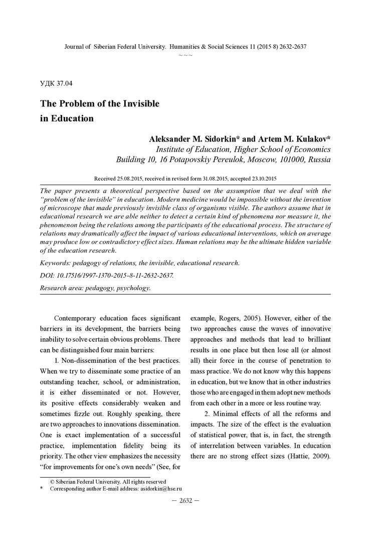 Библиографическое описание:Sidorkin, Aleksander. The Problem of the Invisible in Education = Проблема невидимого в образовании / A. M. Sidorkin, A. M. Kulakov. - Текст : непосредственный // Журнал Сибирского федерального университета. Гуманитарные науки. - 2015. - Т. 8, № 11. - С. 2632-2637. - Библиогр.: с. 2636-2637. - ISSN 1997-1370.