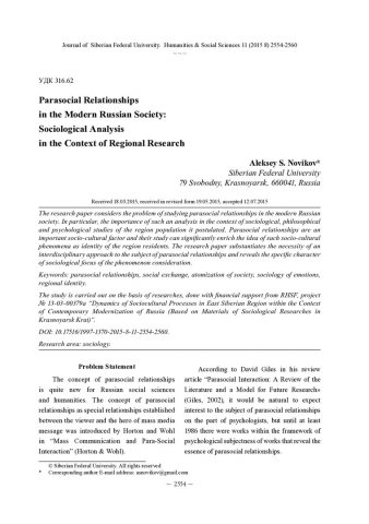 Библиографическое описание:Novikov, Aleksey. Parasocial Relationships in the Modern Russian Society: Sociological Analysis in the Context of Regional Research = Парасоциальные отношения в современном российском обществе: социологический анализ в контексте региональных исследований / A. S. Novikov. - Текст : непосредственный // Журнал Сибирского федерального университета. Гуманитарные науки. - 2015. - Т. 8, № 11. - С. 2554-2560. - Библиогр.: с. 2558-2560. - ISSN 1997-1370.