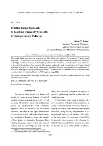 Аннотация:Речь идет о современных тенденциях в подготовке студентов вузов, основанных на практикоориентированном подходе к высшему профессиональному образованию. Подход, основанный на практике, широко исследуется в современной зарубежной педагогике и дидактике в связи со сменой образовательных приоритетов.