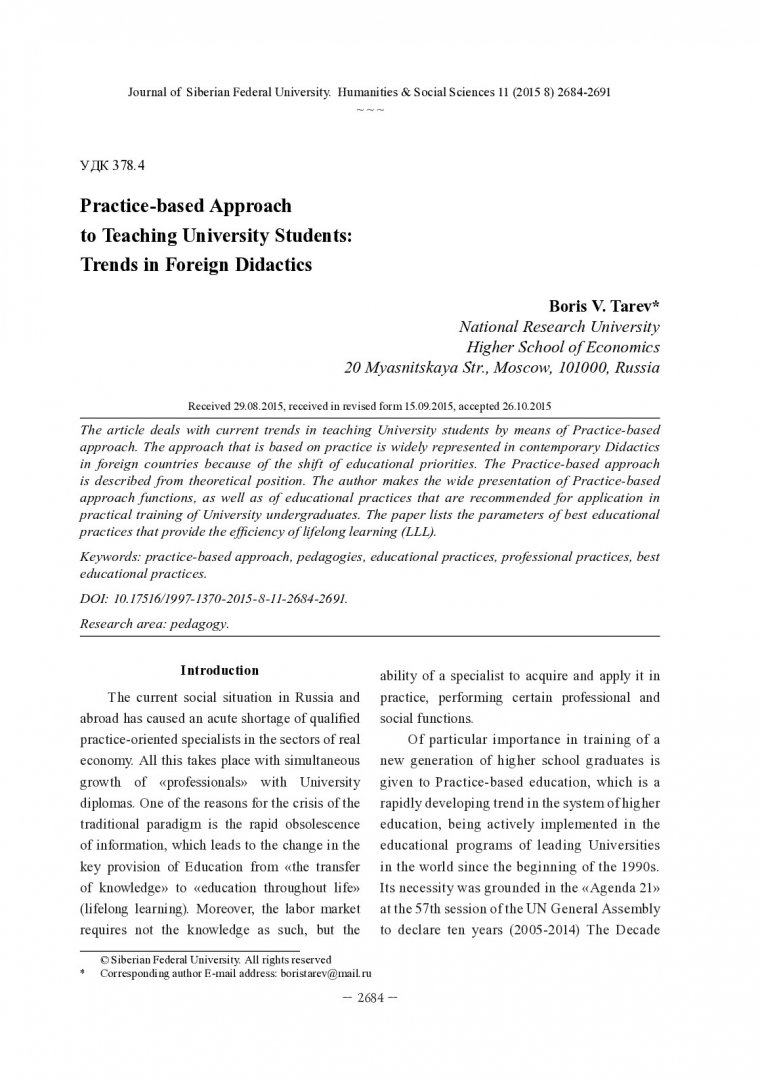 Библиографическое описание:Tarev, Boris. Practice-based Approach to Teaching University Students: Trends in Foreign Didactics = Зарубежные тенденции в практикоориентированной подготовке студентов / B. V. Tarev. - Текст : непосредственный // Журнал Сибирского федерального университета. Гуманитарные науки. - 2015. - Т. 8, № 11. - С. 2684-2691. - Библиогр.: с. 2690-2691. - ISSN 1997-1370.