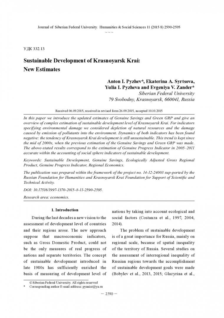 Библиографическое описание:Sustainable Development of Krasnoyarsk Krai: New Estimates = Устойчивое развитие Красноярского края: новые оценки / A. I. Pyzhev [и др.]. - Текст : непосредственный // Журнал Сибирского федерального университета. Гуманитарные науки. - 2015. - Т. 8, № 11. - С. 2590-2595. - Библиогр.: с. 2594-2595. - ISSN 1997-1370.