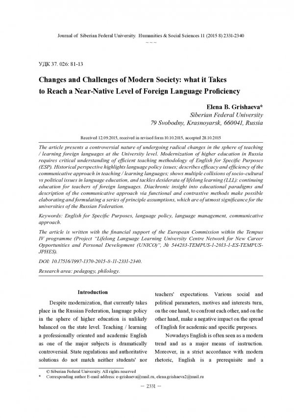 Библиографическое описание:Grishaeva, Elena. Changes and Challenges of Modern Society: what it Takes to Reach a Near-Native Level of Foreign Language Proficiency = Изменения и вызовы современного общества: способы достижения профессионального уровня владения иностранным языком / E. B. Grishaeva. - Текст : непосредственный // Журнал Сибирского федерального университета. Гуманитарные науки. - 2015. - Т. 8, № 11. - С. 2331-2340. - Библиогр.: с. 2339-2340. - ISSN 1997-1370.