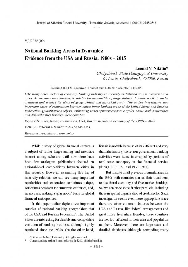 Библиографическое описание:Nikitin, Leonid. National Banking Areas in Dynamics: Evidence from the USA and Russia, 1980s – 2015 = Национальные банковские пространства в динамике (на примерах США и России в 1980-е – 2015 гг.) / L. V. Nikitin. - Текст : непосредственный // Журнал Сибирского федерального университета. Гуманитарные науки. - 2015. - Т. 8, № 11. - С. 2545-2553. - Библиогр.: с. 2551. - ISSN 1997-1370.