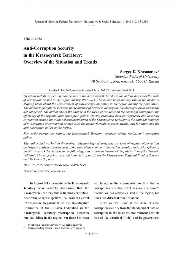 Библиографическое описание:Krasnousov, Sergey. Anti-Corruption Security in the Krasnoyarsk Territory: Overview of the Situation and Trends = Состояние и тенденции антикоррупционной безопасности в Красноярском крае / S. D. Krasnousov. - Текст : непосредственный // Журнал Сибирского федерального университета. Гуманитарные науки. - 2015. - Т. 8, № 11. - С. 2485-2498. - Библиогр.: с. 2495-2498. - ISSN 1997-1370.