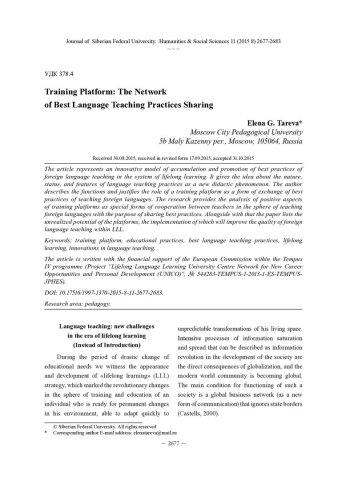 Библиографическое описание:Tareva, Elena. Training Platform: The Network of Best Language Teaching Practices Sharing = Стажировочная площадка как форма сетевого обмена передовыми лингвообразовательными практиками / E. G. Tareva. - Текст : непосредственный // Журнал Сибирского федерального университета. Гуманитарные науки. - 2015. - Т. 8, № 11. - С. 2677-2683. - Библиогр.: с. 2683. - ISSN 1997-1370.