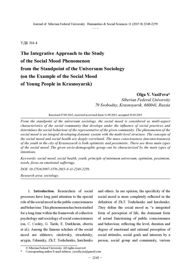 The Integrative Approach to the Study of the Social Mood Phenomenon from the Standpoint of the Universum Sociology (on the Example of the Social Mood of Young People in Krasnoyarsk)