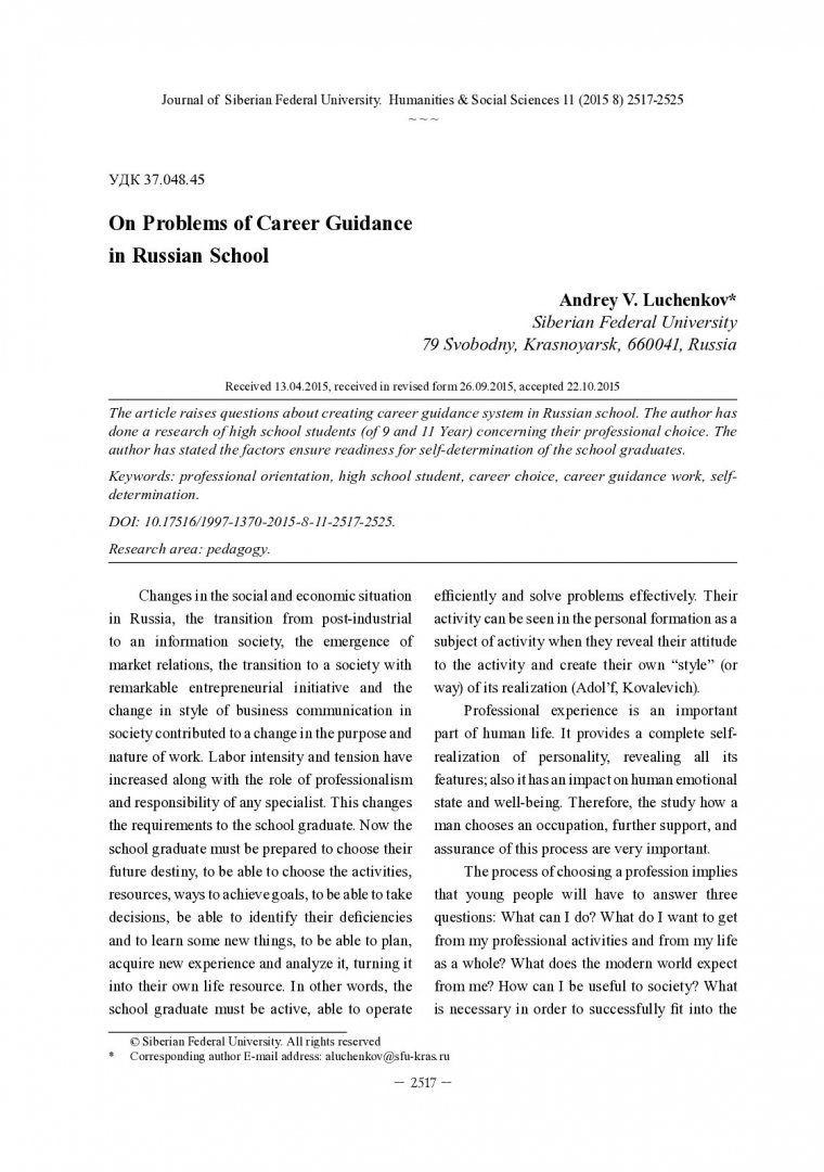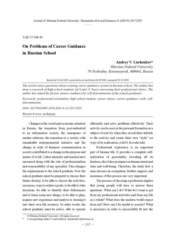 Библиографическое описание:Luchenkov, Andrey. On Problems of Career Guidance in Russian School = О проблемах профориентационной работы в российской школе / A. V. Luchenkov. - Текст : непосредственный // Журнал Сибирского федерального университета. Гуманитарные науки. - 2015. - Т. 8, № 11. - С. 2517-2525. - Библиогр.: с. 2524-2525. - ISSN 1997-1370.