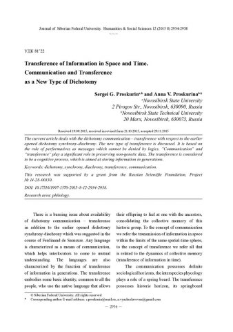 Библиографическое описание:Proskurin, Sergei. Transference of Information in Space and Time. Communication and Transference as a New Type of Dichotomy = Передача информации во времени и пространстве. "Коммуникация и передача" как новый тип дихотомии / S. G. Proskurin, A. V. Proskurina. - Текст : непосредственный // Журнал Сибирского федерального университета. Гуманитарные науки. - 2015. - Т. 8, № 12. - С. 2934-2938. - Библиогр.: с. 2937-2938. - ISSN 1997-1370.
