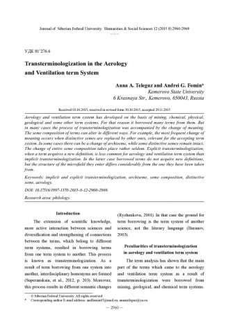 Аннотация:Изучены особенности процесса транстерминологизации терминов-слов и многокомпонентных терминов из терминосистем геологии, химии, горного дела, физики и других наук в терминосистему аэрологии и вентиляции в английском и русском языках.