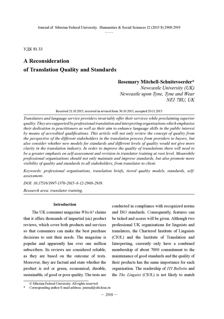 Библиографическое описание: Mitchell-Schuitevoerder, Rosemary. A Reconsideration of Translation Quality and Standards = Повторное обращение к вопросам качества переводов и стандартов / R. Mitchell-Schuitevoerder. - Текст : непосредственный // Журнал Сибирского федерального университета. Гуманитарные науки. - 2015. - Т. 8, № 12. - С. 2908-2919. - Библиогр.: с. 2919. - ISSN 1997-1370.