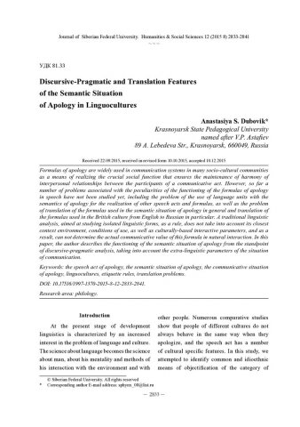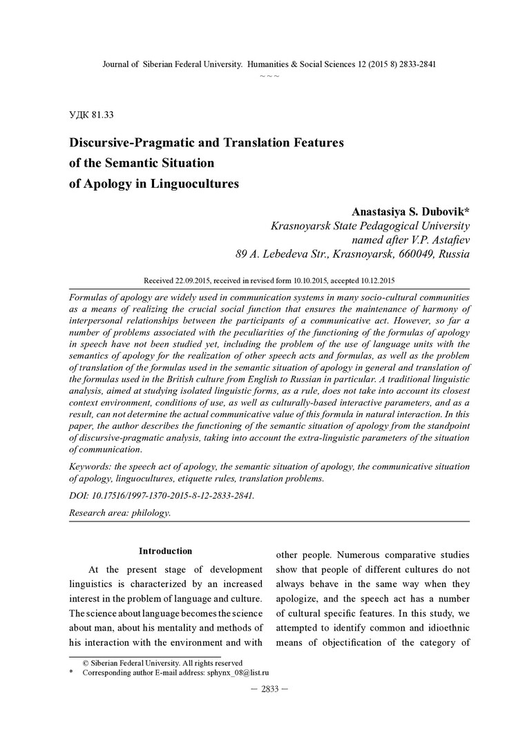 Библиографическое описание: Dubovik, Anastasiya. Discursive-Pragmatic and Translation Features of the Semantic Situation of Apology in Linguocultures = Дискурсивно-прагматические и переводческие особенности семантической ситуации извинения в лингвокультурах / A. S. Dubovik. - Текст : непосредственный // Журнал Сибирского федерального университета. Гуманитарные науки. - 2015. - Т. 8, № 12. - С. 2833-2841. - Библиогр.: с. 2839-2841. - ISSN 1997-1370.
