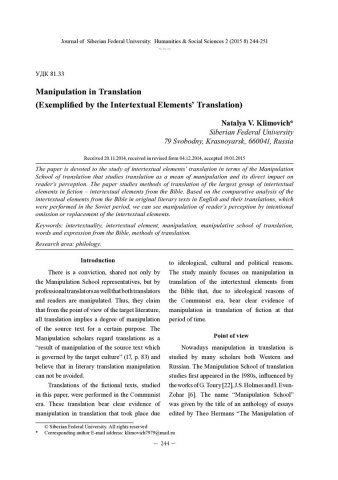 Библиографическое описание:Klimovich, Natalya. Manipulation in Translation (Exemplified by the Intertextual Elements` Translation) = Манипуляция в переводе (на примере перевода интертекстуальных элементов) / N. Klimovich. - Текст : непосредственный // Журнал Сибирского федерального университета. Гуманитарные науки. - 2015. - Т. 8, № 2. - С. 244-251. - Библиогр.: с. 250-251 (23 назв.). - ISSN 1997-1370.