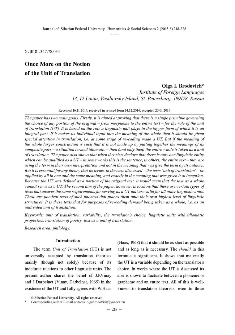 Библиографическое описание: Brodovich, Olga. Once More on the Notion of the Unit of Translation = Еще раз о единице перевода / O. I. Brodovich. - Текст : непосредственный // Журнал Сибирского федерального университета. Гуманитарные науки. - 2015. - Т. 8, № 2. - С. 218-228. - Библиогр.: с. 227-228 (9 назв.). - ISSN 1997-1370.