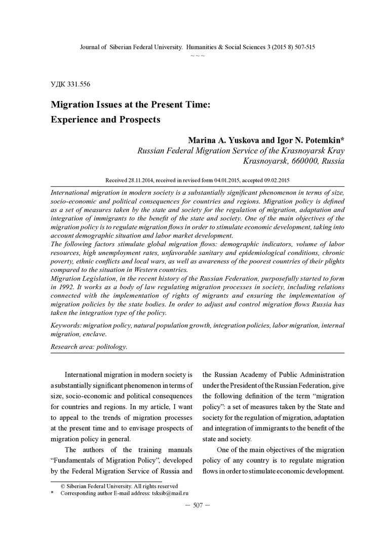Библиографическое описание: Yuskova, Marina. Migration Issues at the Present Time: Experience and Prospects = Миграционный вопрос на современном этапе: опыт и перспективы / M. A. Yuskova, I. N. Potemkin. - Текст : непосредственный // Журнал Сибирского федерального университета. Гуманитарные науки. - 2015. - Т. 8, № 3. - С. 507-515. - Библиогр.: с. 514-515 (11 назв.). - ISSN 1997-1370.