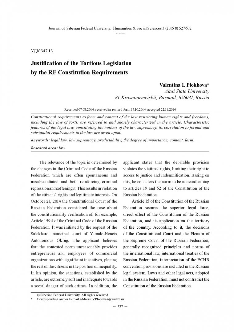 Библиографическое описание:Plokhova, Valentina. Justification of the Tortious Legislation by the RF Constitution Requirements = Обоснование деликтного законодательства требованиями Конституции РФ / V. I. Plokhova. - Текст : непосредственный // Журнал Сибирского федерального университета. Гуманитарные науки. - 2015. - Т. 8, № 3. - С. 527-532. - Библиогр.: с. 532 (3 назв.). - ISSN 1997-1370.