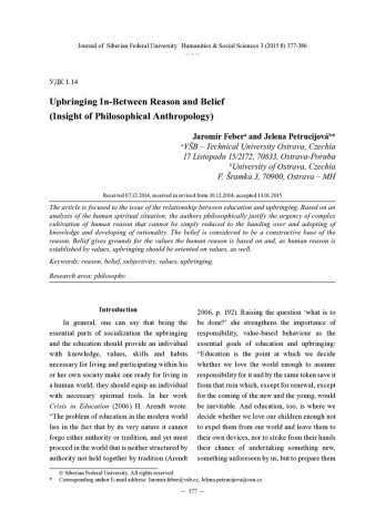 Библиографическое описание: Feber, Jaromir. Upbringing in-between reason and belief (insight of philosophical anthropology) = Воспитание между разумом и верой (подход философской антропологии) / Ja. Feber, Je. Petrucijova. - Текст : непосредственный // Журнал Сибирского федерального университета. Гуманитарные науки. - 2015. - Т. 8, № 3. - С. 377-386. - Библиогр.: с. 385-386 (12 назв.). - ISSN 1997-1370.