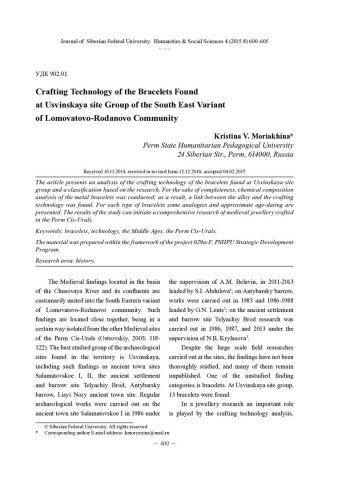 Библиографическое описание:Moriakhina, Kristina. Crafting Technology of the Bracelets Found at Usvinskaya site Group of the South East Variant of Lomovatovo-Rodanovo Community = Технология изготовления браслетов Усьвинской группы памятников юго-восточного варианта ломоватово-родановской общности / K. V. Moriakhina. - Текст : непосредственный // Журнал Сибирского федерального университета. Гуманитарные науки. - 2015. - Т. 8, № 4. - С. 600-605. - Библиогр.: с. 604 (11 назв.). - ISSN 1997-1370.