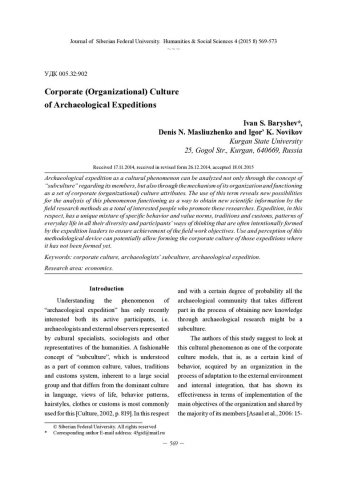 Библиографическое описание: Baryshev, Ivan. Corporate (Organizational) Culture of Archaeological Expeditions = Корпоративная (организационная) культура археологических экспедиций / I. S. Baryshev, D. N. Masliuzhenko, I. K. Novikov. - Текст : непосредственный // Журнал Сибирского федерального университета. Гуманитарные науки. - 2015. - Т. 8, № 4. - С. 569-573. - Библиогр.: с. 573 (5 назв.). - ISSN 1997-1370.