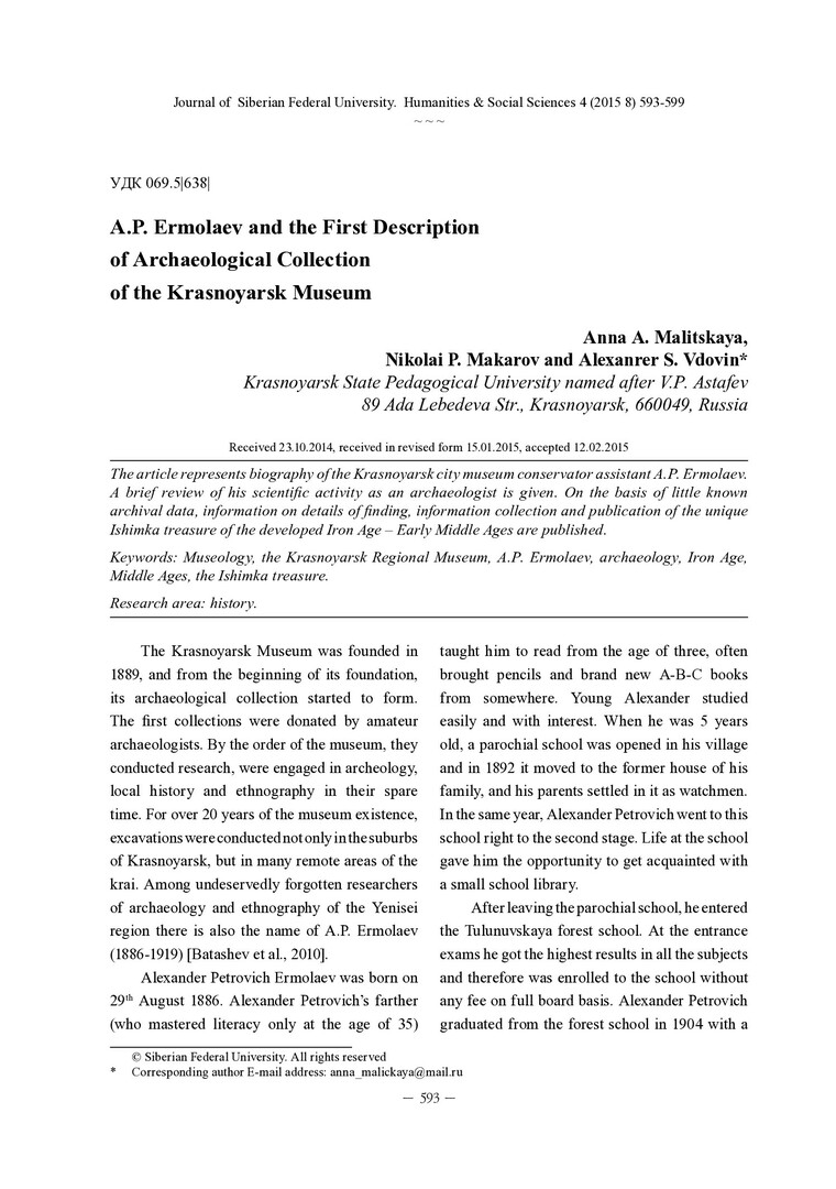 Библиографическое описание:Malitskaya, Anna. A. P. Ermolaev and the First Description of Archaeological Collection of the Krasnoyarsk Museum = А. П. Ермолаев и первое описание археологической коллекции Красноярского музея / A. A. Malitskaya, N. P. Makarov, A. S.Vdovin. - Текст : непосредственный // Журнал Сибирского федерального университета. Гуманитарные науки. - 2015. - Т. 8, № 4. - С. 593-599. - Библиогр.: с. 597-599 (9 назв.). - ISSN 1997-1370.