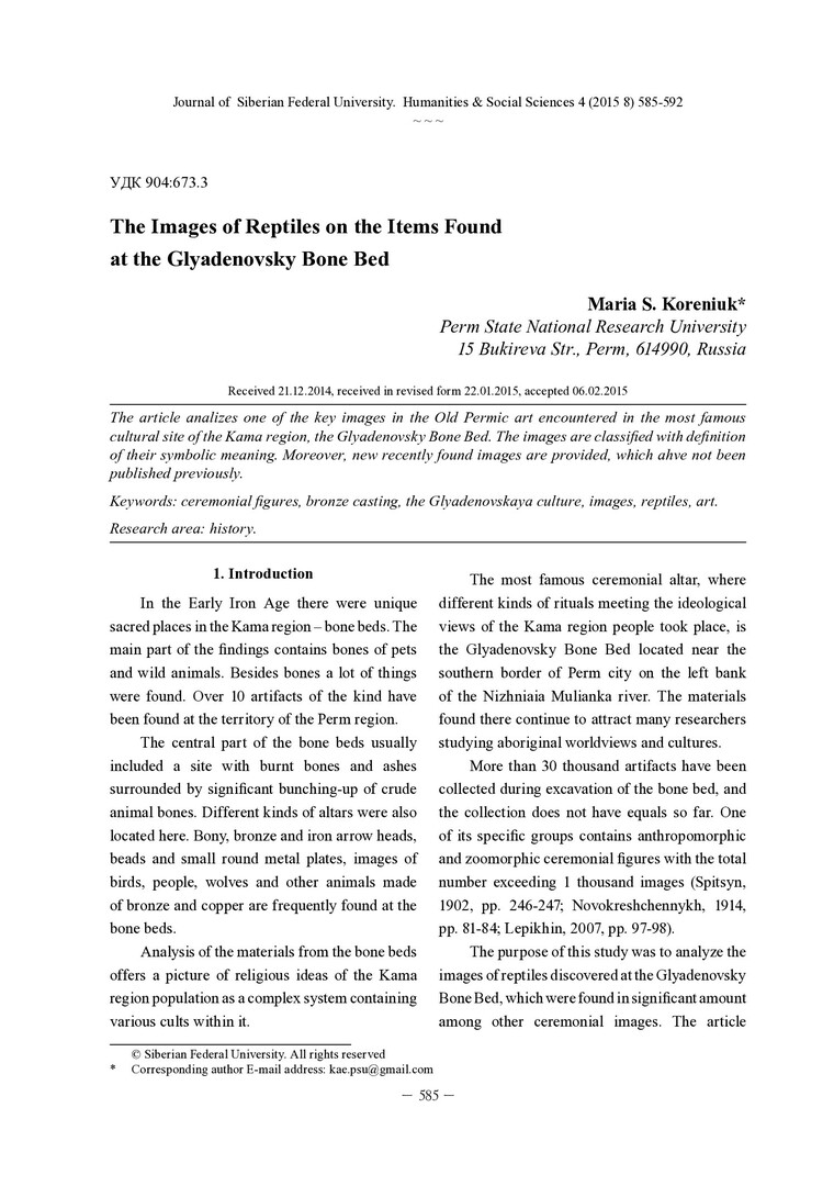 Библиографическое описание:Koreniuk, Maria. The Images of Reptiles on the Items Found at the Glyadenovsky Bone Bed = Изображения пресмыкающихся в материалах Гляденовского костища / M. S. Koreniuk. - Текст : непосредственный // Журнал Сибирского федерального университета. Гуманитарные науки. - 2015. - Т. 8, № 4. - С. 585-592. - Библиогр.: с. 590 (15 назв.). - ISSN 1997-1370.