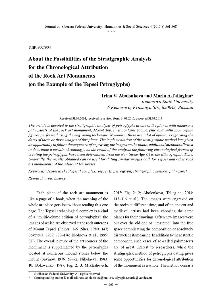 Библиографическое описание:Abolonkova, Irina. About the Possibilities of the Stratigraphic Analysis for the Chronological Attribution of the Rock Art Monuments (on the Example of the Tepsei Petroglyphs) = О возможностях стратиграфического анализа для хронологической атрибуции памятников наскального искусства (на примере петроглифов Тепсея) / I. V. Abolonkova, M. A. Taliagina. - Текст : непосредственный // Журнал Сибирского федерального университета. Гуманитарные науки. - 2015. - Т. 8, № 4. - С. 561-568. - Библиогр.: с. 565-568 (25 назв.). - ISSN 1997-1370.