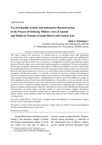 Библиографическое описание:Khudiakov, Julius. Use of Scientific-Artistic and Substantive Reconstruction in the Process of Studying Military Arts of Ancient and Medieval Nomads of South Siberia and Central Asia = Использование научно-художественных и предметных реконструкций в процессе изучения военного дела древних и средневековых номадов Южной Сибири и Центральной Азии / Ju. S. Khudiakov. - Текст : непосредственный // Журнал Сибирского федерального университета. Гуманитарные науки. - 2015. - Т. 8, № 4. - С. 658-669. - Библиогр.: с. 666 (37 назв.). - ISSN 1997-1370.