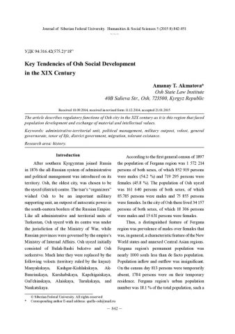 Библиографическое описание:Akmatova, Amanay. Key Tendencies of Osh Social Development in the XIX Century = Основные тенденции социального развития города Ош в XIX веке / A. T. Akmatova. - Текст : непосредственный // Журнал Сибирского федерального университета. Гуманитарные науки. - 2015. - Т. 8, № 5. - С. 842-851. - Библиогр.: с. 848-851 (54 назв.). - ISSN 1997-1370.