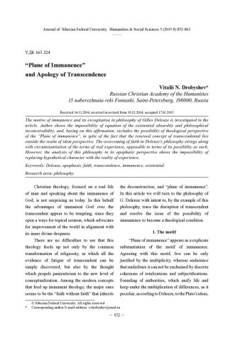 Библиографическое описание: Drobyshev, Vitalii. "Plane of Immanence" and Apology of Transcendence = Плоскость имманентности и апология трансцендентности / V. N. Drobyshev. - Текст : непосредственный // Журнал Сибирского федерального университета. Гуманитарные науки. - 2015. - Т. 8, № 5. - С. 852-863. - Библиогр.: с. 862-863 (18 назв.). - ISSN 1997-1370.