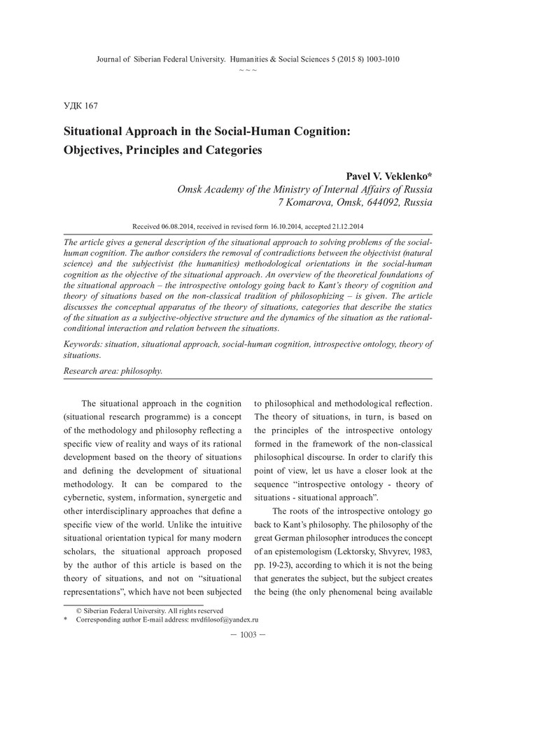 Библиографическое описание: Veklenko, Pavel. Situational Approach in the Social-Human Cognition: Objectives, Principles and Categories = Ситуационный подход в социально-гуманитарном познании: задачи, принципы, категории / P. V. Veklenko. - Текст : непосредственный // Журнал Сибирского федерального университета. Гуманитарные науки. - 2015. - Т. 8, № 5. - С. 1003-1010. - Библиогр.: с. 1009 (12 назв.). - ISSN 1997-1370.