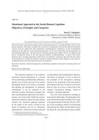 Аннотация: Дана общая характеристика ситуационного подхода к решению проблем социально-гуманитарного познания. В качестве задачи ситуационного подхода рассматривается снятие противоречия между объективистской (естественно-научной) и субъективистской (гуманитарной) методологическими ориентациями в социально- гуманитарном познании. Осуществляется краткий обзор теоретических оснований ситуационного подхода – интроспективной онтологии, восходящей к теории познания И. Канта и теории ситуаций, опирающейся на неклассическую традицию философствования. Рассматривается понятийный аппарат теории ситуаций, категории, описывающие статику ситуации как структуры субъективно-объективной природы, динамику ситуации как кондиционально-смыслового взаимодействия, а также связи между ситуациями.