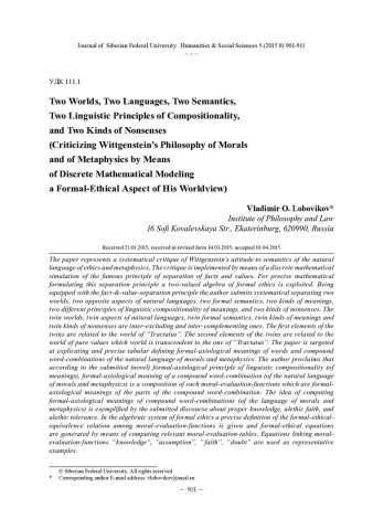 Библиографическое описание:Lobovikov, Vladimir. Two Worlds, Two Languages, Two Semantics, Two Linguistic Principles of Compositionality, and Two Kinds of Nonsenses (Criticizing Wittgenstein’s philosophy of morals and of metaphysics by means of discrete mathematical modeling a formal-ethical aspect of his worldview) = Два мира, два языка, две семантики, два лингвистических принципа композиционности и два вида бессмыслицы (Критика философии Витгенштейна о морали и метафизике с использованием дискретного математического моделирования формально-этического аспекта его точки зрения) / V. O. Lobovikov. - Текст : непосредственный // Журнал Сибирского федерального университета. Гуманитарные науки. - 2015. - Т. 8, № 5. - С. 901-911. - Библиогр.: с. 909-911 (27 назв.). - ISSN 1997-1370.