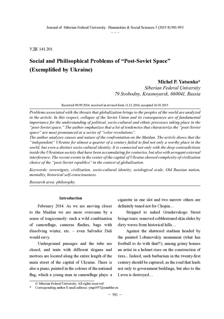 Библиографическое описание: Yatsenko, Michel. Social and Philisophical Problems of "Post-Soviet Space" (Exemplified by Ukraine) = Социально-философские проблемы "постсоветского пространства" (на примере Украины) / M. P. Yatsenko. - Текст : непосредственный // Журнал Сибирского федерального университета. Гуманитарные науки. - 2015. - Т. 8, № 5. - С. 981-993. - Библиогр.: с. 992-993 (6 назв.). - ISSN 1997-1370.