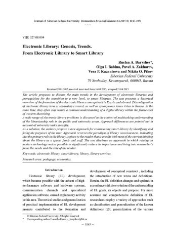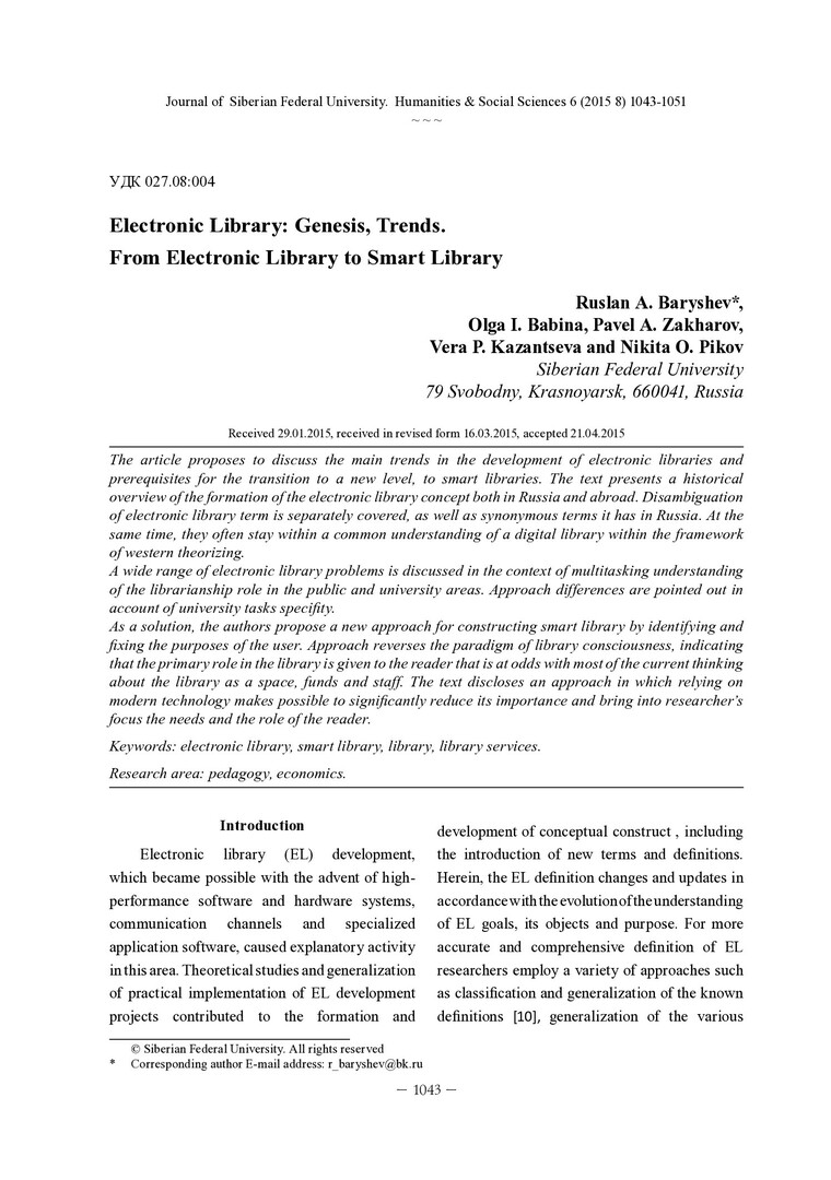 Библиографическое описание:Electronic Library: Genesis, Trends. From Electronic Library to Smart Library = Электронная библиотека: генезис, тренды от электронной библиотеки к смарт-библиотеке / R. A. Baryshev [et al.]. - Текст : непосредственный // Журнал Сибирского федерального университета. Гуманитарные науки. - 2015. - Т. 8, № 6. - С. 1043-1051. - Библиогр.: с. 1048-1050 (37 назв.). - ISSN 1997-1370.