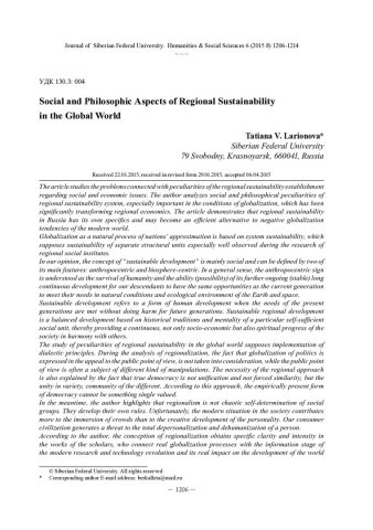 Библиографическое описание:Larionova, Tatiana. Social and Philosophic Aspects of Regional Sustainability in the Global World = Социально-философские аспекты региональной устойчивости в глобальном мире / T. V. Larionova. - Текст : непосредственный // Журнал Сибирского федерального университета. Гуманитарные науки. - 2015. - Т. 8, № 6. - С. 1206-1214. - Библиогр.: с. 1211-1212 (11 назв.). - ISSN 1997-1370.