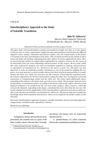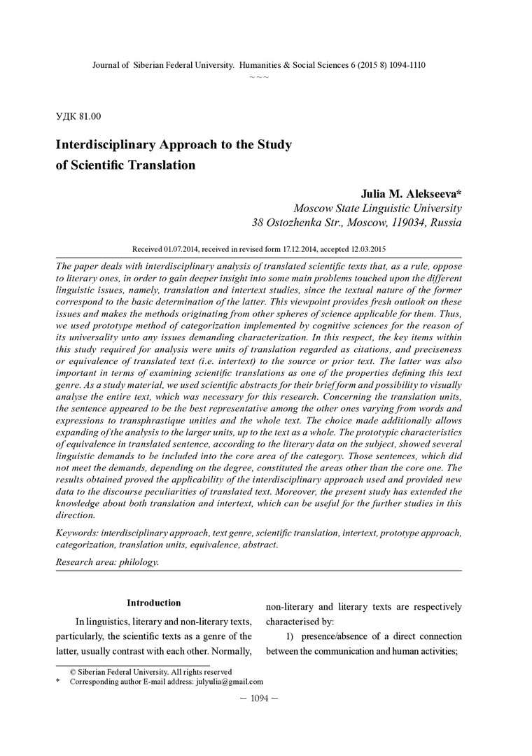 Библиографическое описание:Alekseeva, Julia. Interdisciplinary Approach to the Study of Scientific Translation = Междисциплинарный подход к изучению научных переводов / J. M. Alekseeva. - Текст : непосредственный // Журнал Сибирского федерального университета. Гуманитарные науки. - 2015. - Т. 8, № 6. - С. 1094-1110. - Библиогр.: с. 1107-1109 (37 назв.). - ISSN 1997-1370.