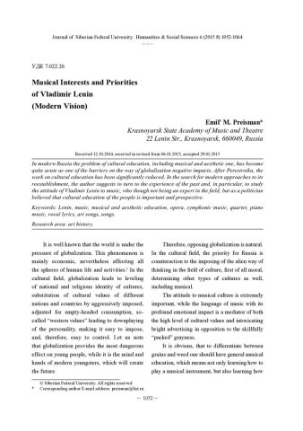 Библиографическое описание:Preisman, Emil’. Musical Interests and Priorities of Vladimir Lenin (Modern Vision) = Музыкальные интересы и приоритеты В.И. Ленина (современное видение) / E. M. Preisman. - Текст : непосредственный // Журнал Сибирского федерального университета. Гуманитарные науки. - 2015. - Т. 8, № 6. - С. 1052-1064. - Библиогр.: с. 1062-1063 (32 назв.). - ISSN 1997-1370.