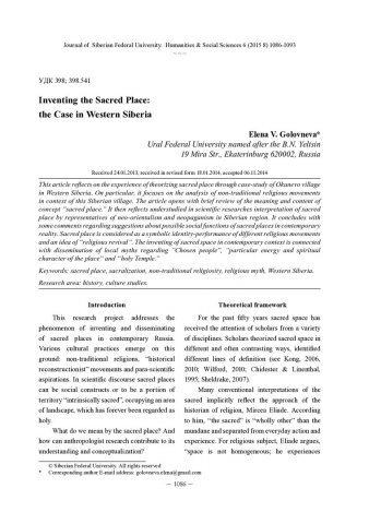 Библиографическое описание:Golovneva, Elena. Inventing the Sacred Place: the Case in Western Siberia = Конструирование сакрального места: случай в Западной Сибири / E. V. Golovneva. - Текст : непосредственный // Журнал Сибирского федерального университета. Гуманитарные науки. - 2015. - Т. 8, № 6. - С. 1086-1093. - Библиогр.: с. 1092-1093 (11 назв.). - ISSN 1997-1370.
