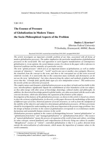 Библиографическое описание:Kravtsov, Dmitry. The Essence of Pressure of Globalization in Modern Times: the Socio-Philosophical Aspects of the Problem = Сущность глобализационного давления современности: социально-философские аспекты проблемы / D. I. Kravtsov. - Текст : непосредственный // Журнал Сибирского федерального университета. Гуманитарные науки. - 2015. - Т. 8, № 6. - С. 1173-1185. - Библиогр.: с. 1170 (11 назв.). - ISSN 1997-1370.