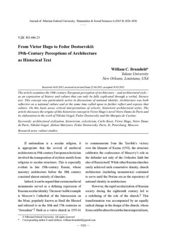 Библиографическое описание:Brumfield, William. From Victor Hugo to Fedor Dostoevskii: 19th-Century Perceptions of Architecture as Historical Text = Виктор Гюго, маркиз де Кюстин и Федор Достоевский: архитектура как исторический текст / W. C. Brumfield. - Текст : непосредственный // Журнал Сибирского федерального университета. Гуманитарные науки. - 2015. - Т. 8, № 6. - С. 1026-1036. - Библиогр.: с. 1033-1035 (22 назв.). - ISSN 1997-1370.