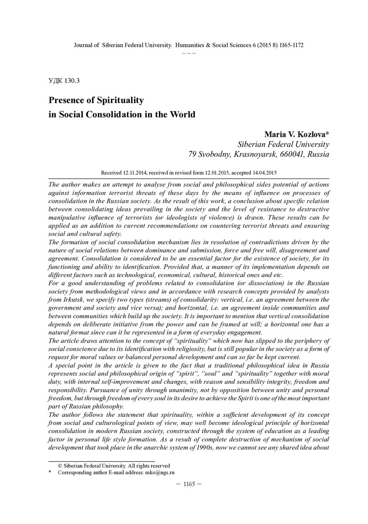 Библиографическое описание:Kozlova, Maria. Presence of Spirituality in Social Consolidation in the World = Духовная составляющая консолидации общества в глобальном мире / M. V. Kozlova. - Текст : непосредственный // Журнал Сибирского федерального университета. Гуманитарные науки. - 2015. - Т. 8, № 6. - С. 1165-1172. - Библиогр.: с. 1170 (11 назв.). - ISSN 1997-1370.